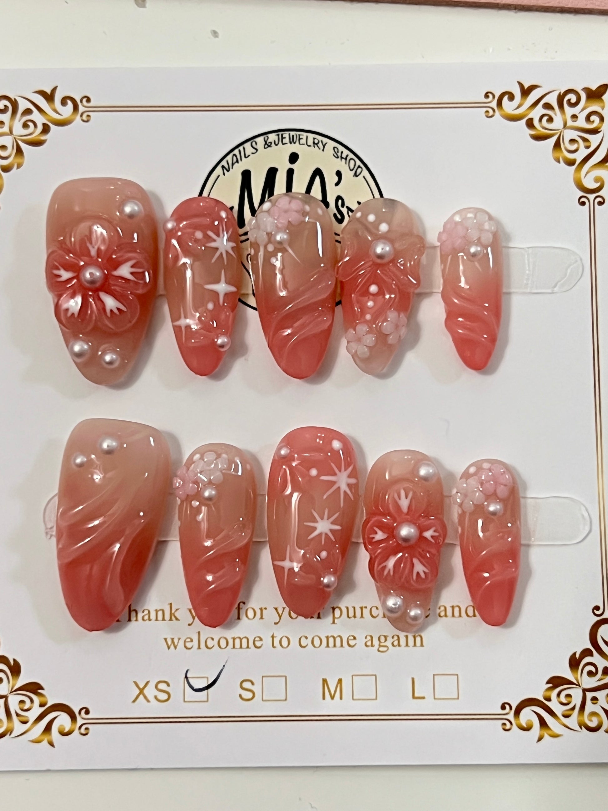 Coral Whisper is a handmade set inspired by the soft elegance of blooming petals and sunset coral hues. This design features a smooth coral-to-blush gradient with delicate white starbursts, 3D floral embellishments, and pearl accents that add a touch of dreamy sophistication. The blend of translucent gloss and intricate floral texture makes it perfect for those who love romantic, feminine charm with a polished twist.