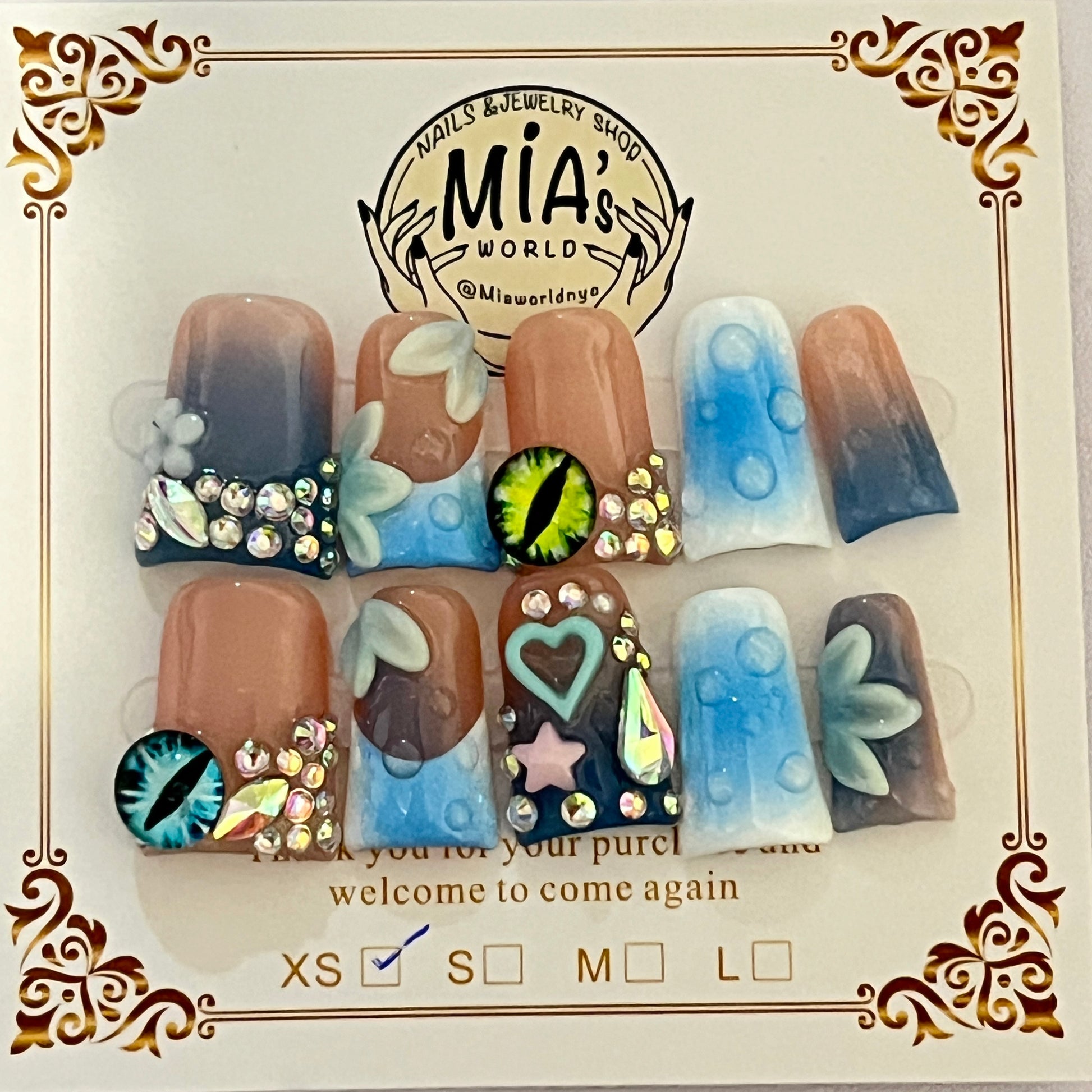 Each set is handcrafted with meticulous attention to detail. Lasts up to 2 weeks with simple application. Includes 10 press-on nails in assorted sizes, adhesive tabs, nail glue, cuticle stick, mini file, and alcohol pad.