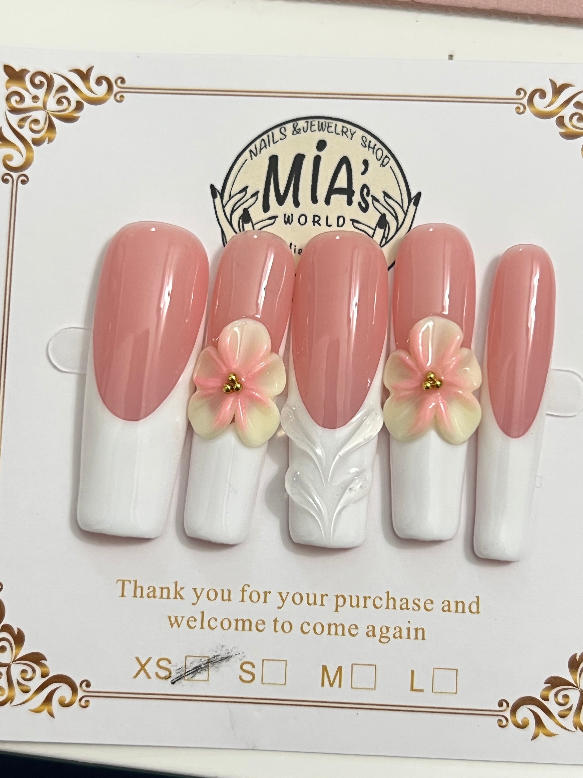 Blush is a set of handmade press-on nails that embodies pure elegance and feminine sophistication. The design pairs a soft blush-pink tone with a crisp white base, creating a timeless French-block contrast. Adorned with delicate 3D gradient flowers and gold bead centers, this set radiates charm and refinement — perfect for bridal looks, romantic dates, or everyday wear with a touch of grace.