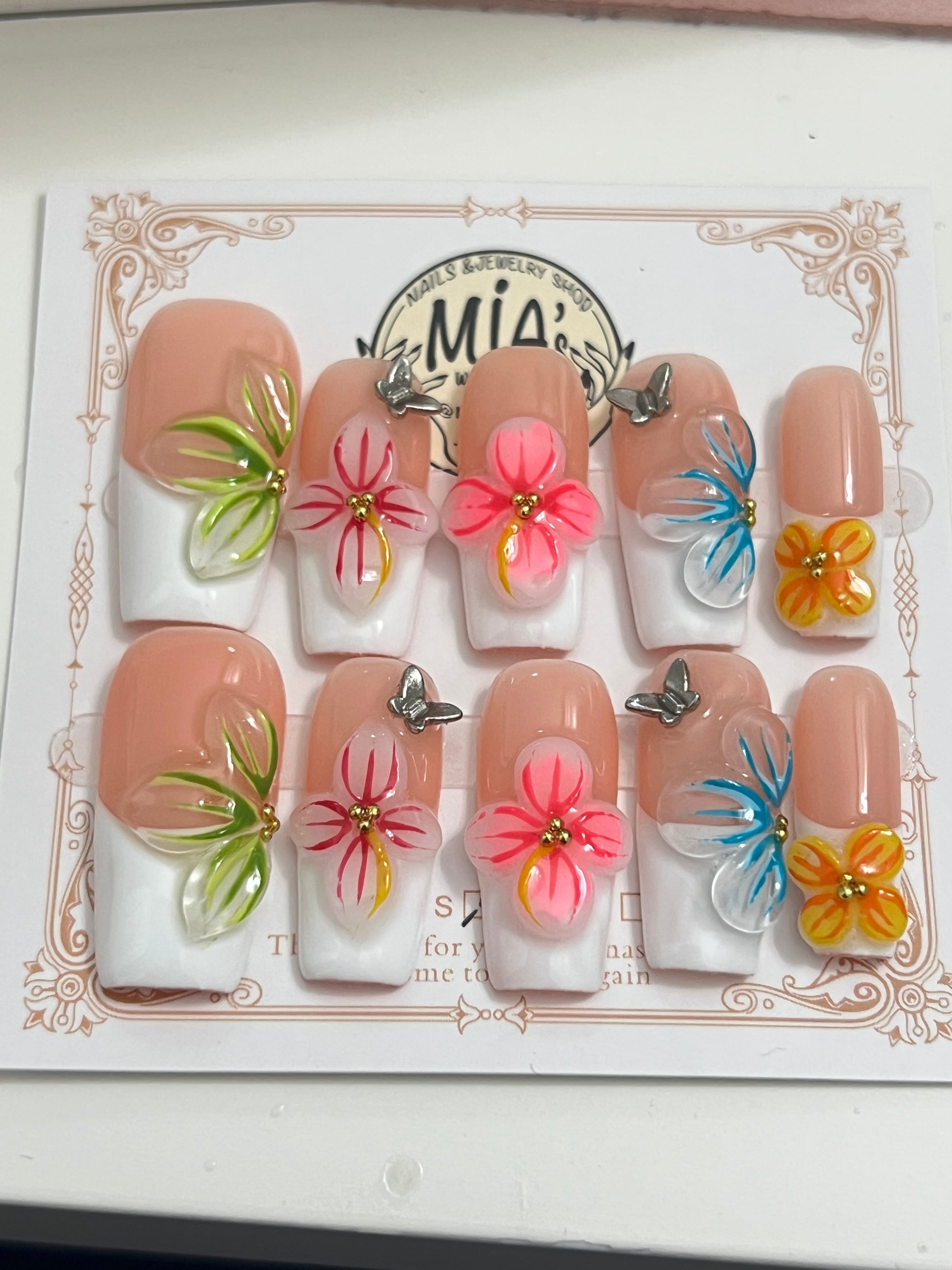 Butterfly is a set of handmade press-on nails that captures the lively charm of a spring garden. Featuring a soft nude-pink and pure white color block base, each nail is adorned with colorful 3D flowers in pink, blue, orange, and green hues. Tiny golden beads and metallic butterfly accents add a whimsical, graceful touch — perfect for spring outings, summer vacations, or anyone who loves playful elegance with a touch of artistry.