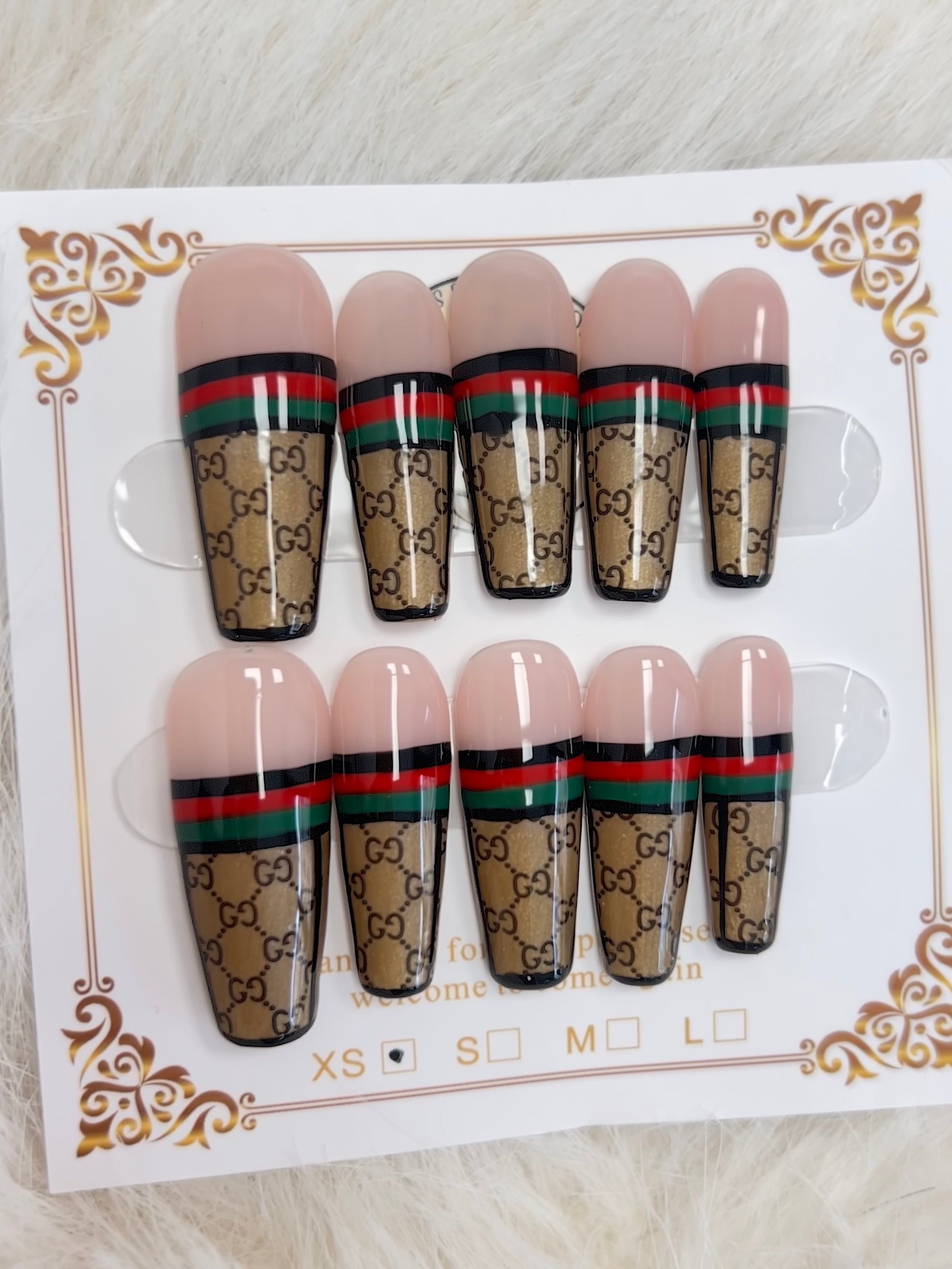 A luxury-inspired press-on nail set featuring nude blush bases, classic stripe accents, and elegant monogram patterns. A refined, fashion-forward design perfect for elevated everyday wear.