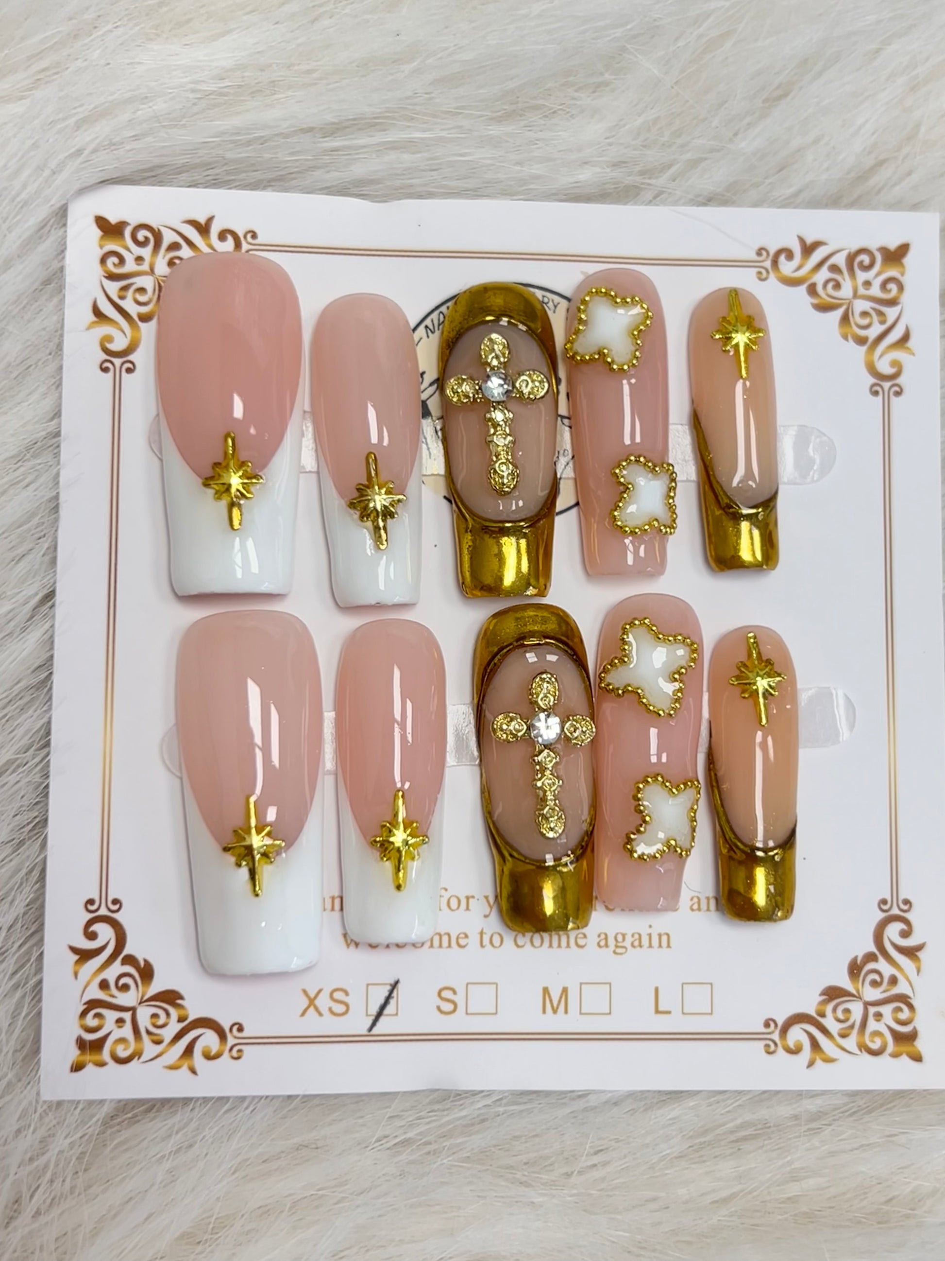 Luxurious pink and white gradient design featuring ornate gold cross embellishments and starburst accents. A bold statement of faith and fashion.