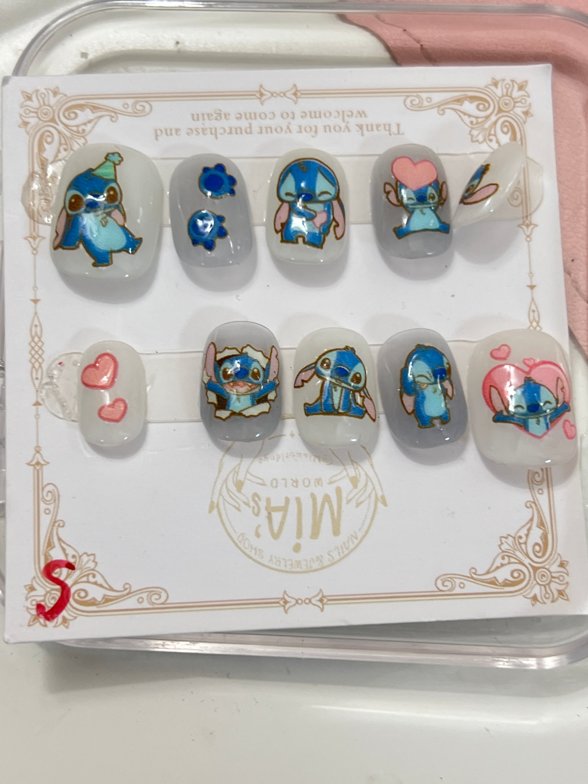 Experiment 626 is a set of handmade press-on nails featuring adorable blue cartoon characters with playful poses and heart details. Designed in soft white and gray tones with pops of pink and blue, this set radiates cheerful, youthful energy. Perfect for fans of cute cosmic creatures or anyone who loves bringing a smile to their fingertips, this design adds a lighthearted twist to any casual or cozy look.