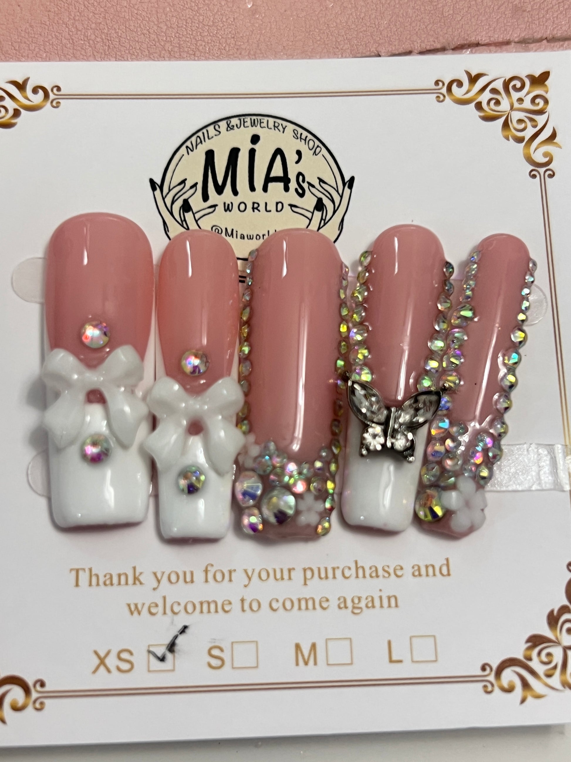 Fairy is a handmade press-on nail set featuring milky nude pink and pearl white with 3D bows, iridescent crystals, and a silver butterfly charm. The design offers an elegant, romantic look suitable for weddings, dates, or special occasions.
