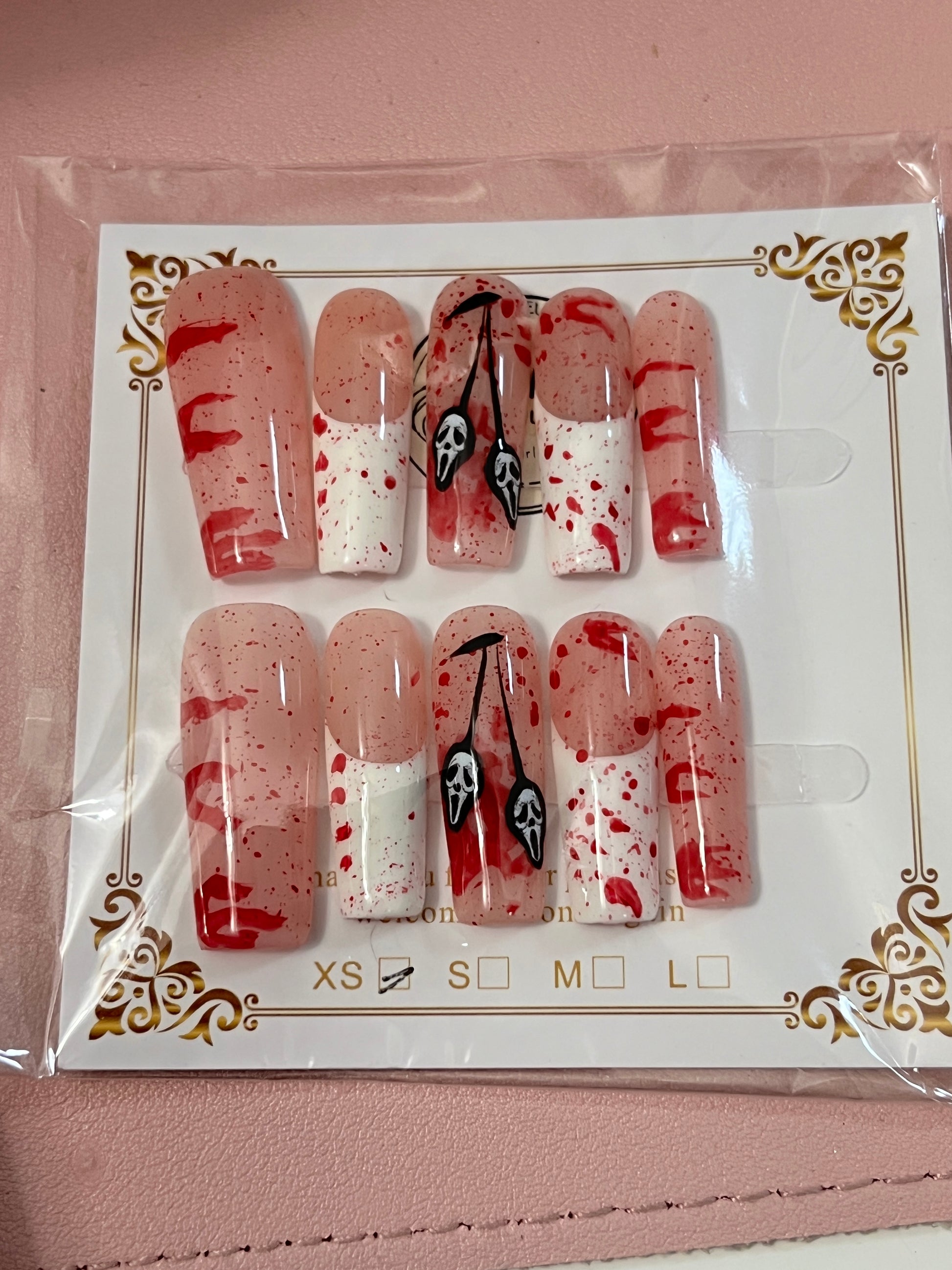 Bring your spooky glam to life with Bloody Scream! Featuring nude transparent bases with white accents, hand-painted blood splatter, and the iconic Ghostface mask — this Halloween-ready nail set fuses horror art with chic fashion edge. Perfect for costume parties, gothic outfits, or anyone who loves a daring statement look.