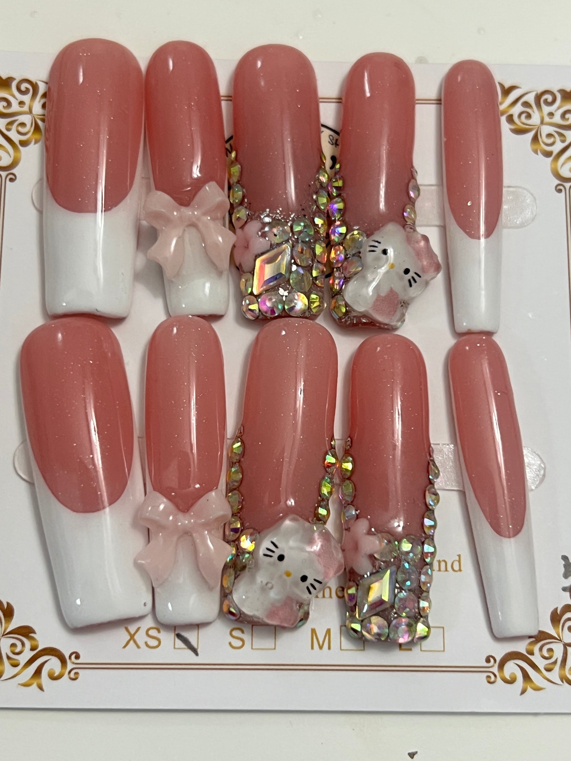 Kitty Princess is a handmade press-on nail set featuring soft pink-and-white French tones with rhinestone accents, 3D bows, and an adorable kitty charm. The shimmering AB crystals catch light beautifully, suitable for special occasions, birthdays, or glamorous events.
