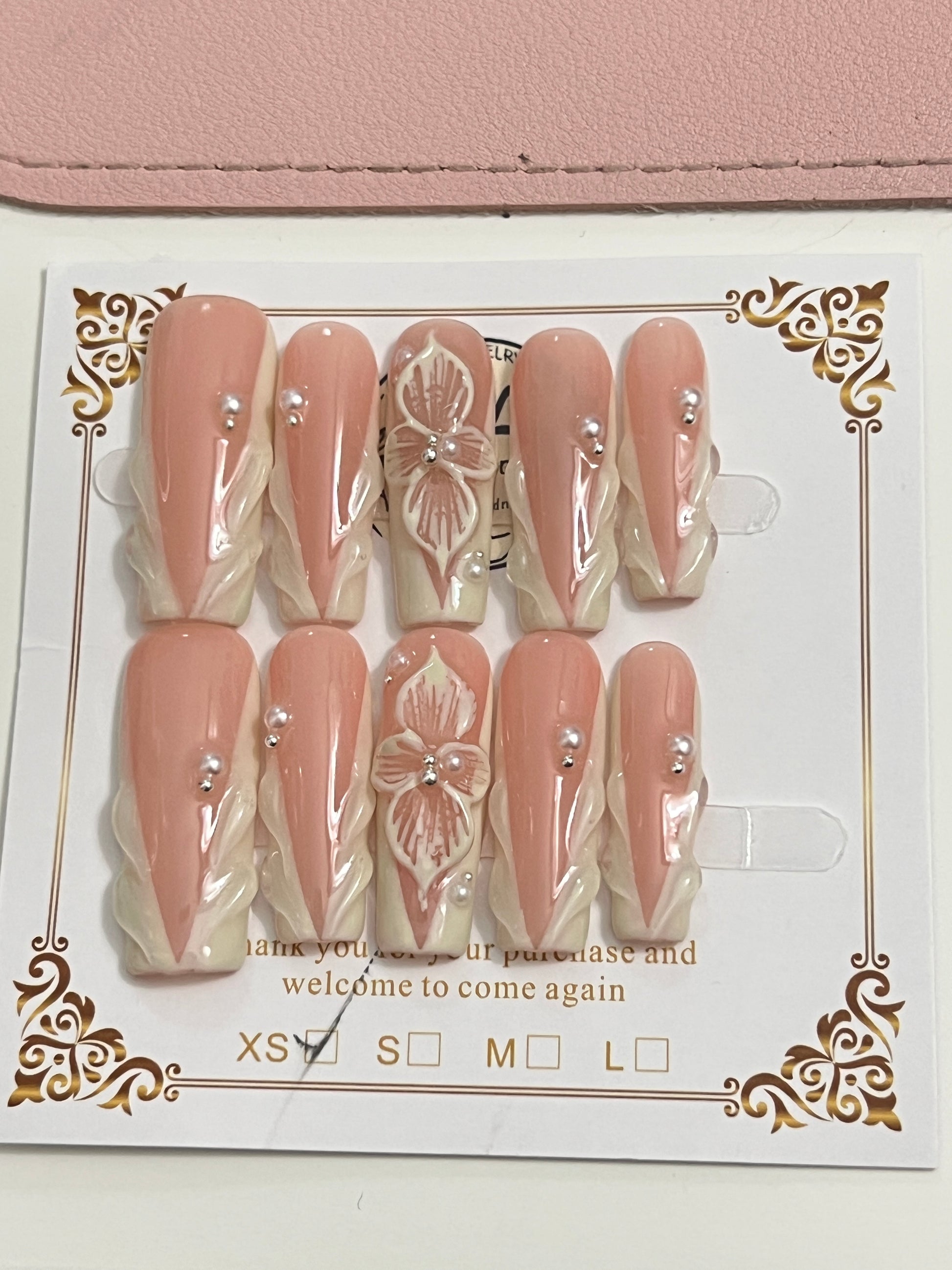 Experience timeless elegance with our Long French 3D flower nail set. This exquisite handmade design features a classic nude base beautifully enhanced with white decorative patterns and stunning 3D floral embellishments, creating a sophisticated French-inspired look with dimensional artistry.