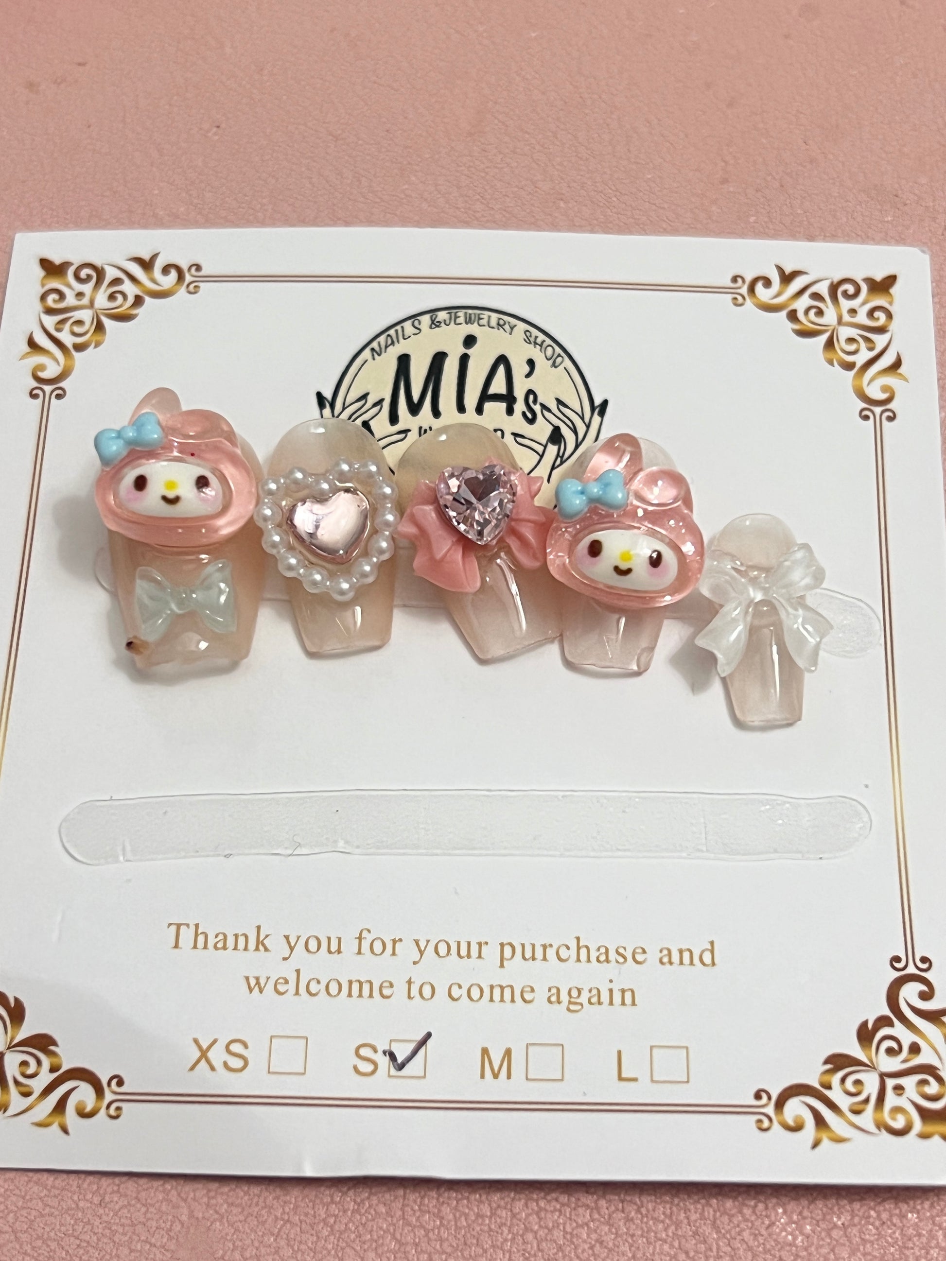 Melody is a handmade press-on nail set featuring creamy nude pink tones with 3D My Melody charms, pastel blue bows, and pearl heart frames. The design includes a glossy jelly base and crystal pink gems, suitable for pastel lovers who enjoy sweet, playful aesthetics.