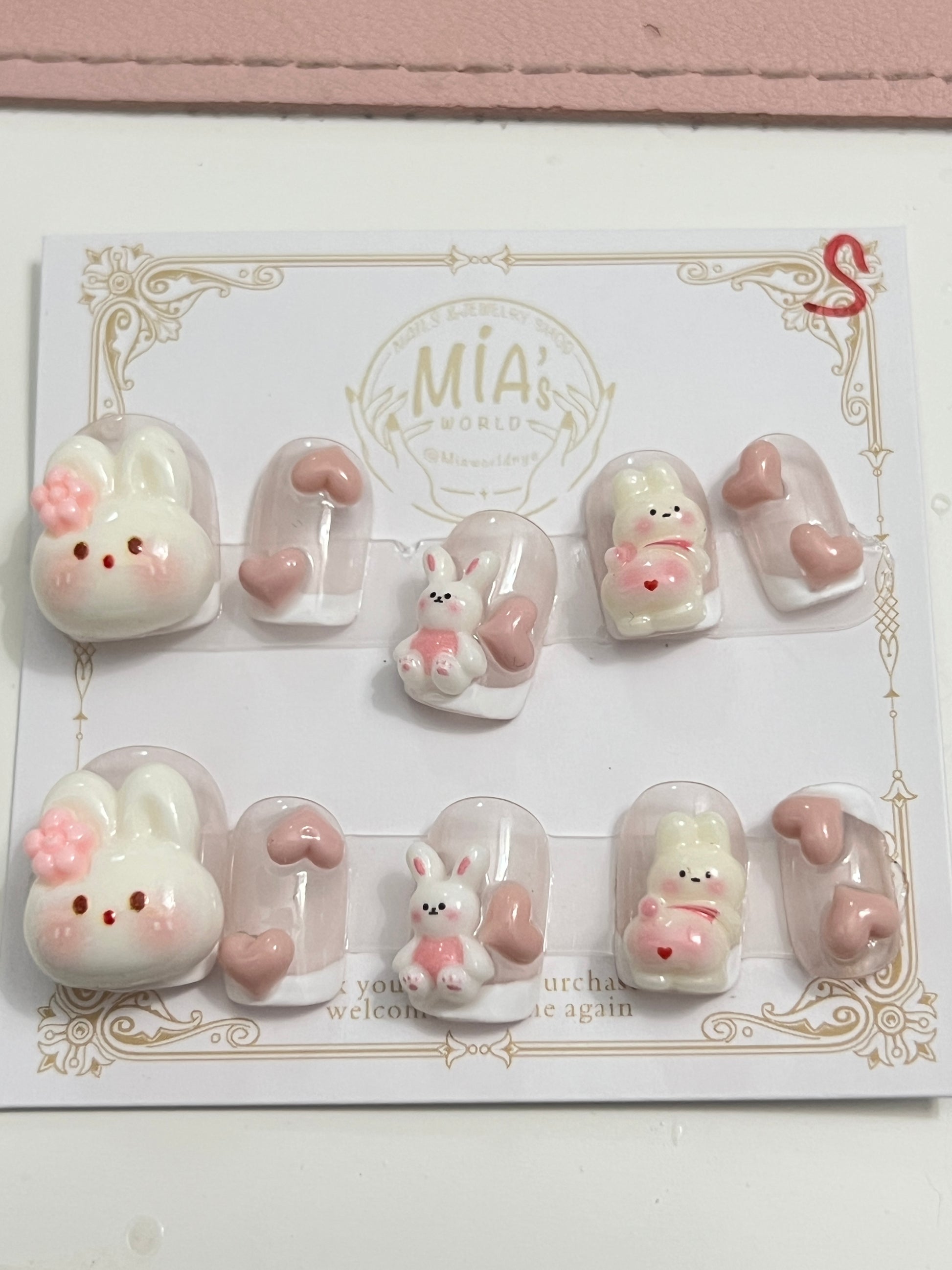 My Bunny is a handmade press-on nail set featuring hand-sculpted 3D bunny characters, heart embellishments, and soft blush tones. The design offers a sweet, playful look suitable for spring, Valentine's Day, or as a gift for bunny enthusiasts.