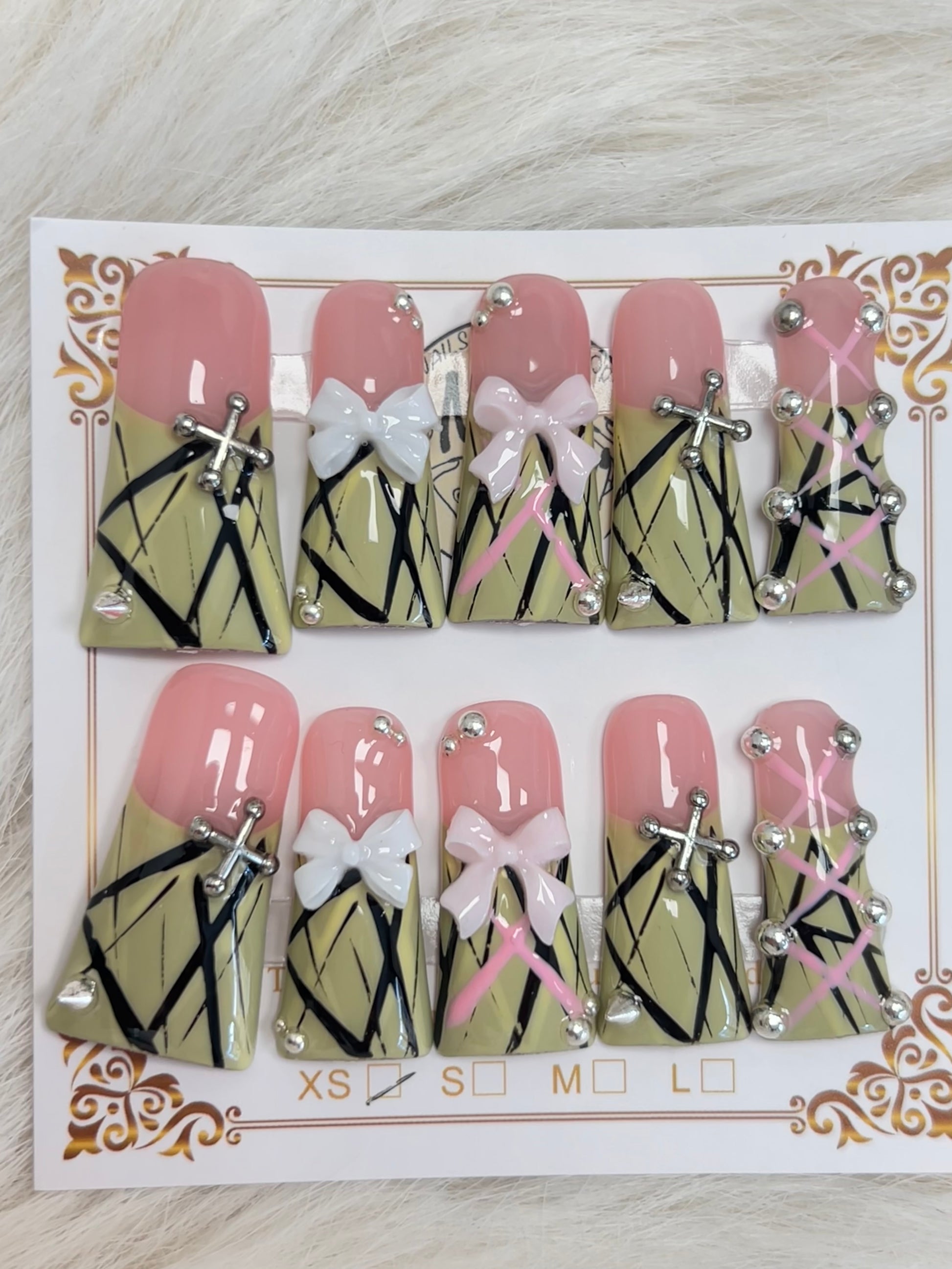 Whimsical pink ombre with gold-green French tips featuring intricate black corset lace patterns, bow charms, and rhinestone accents. A fairytale fantasy.