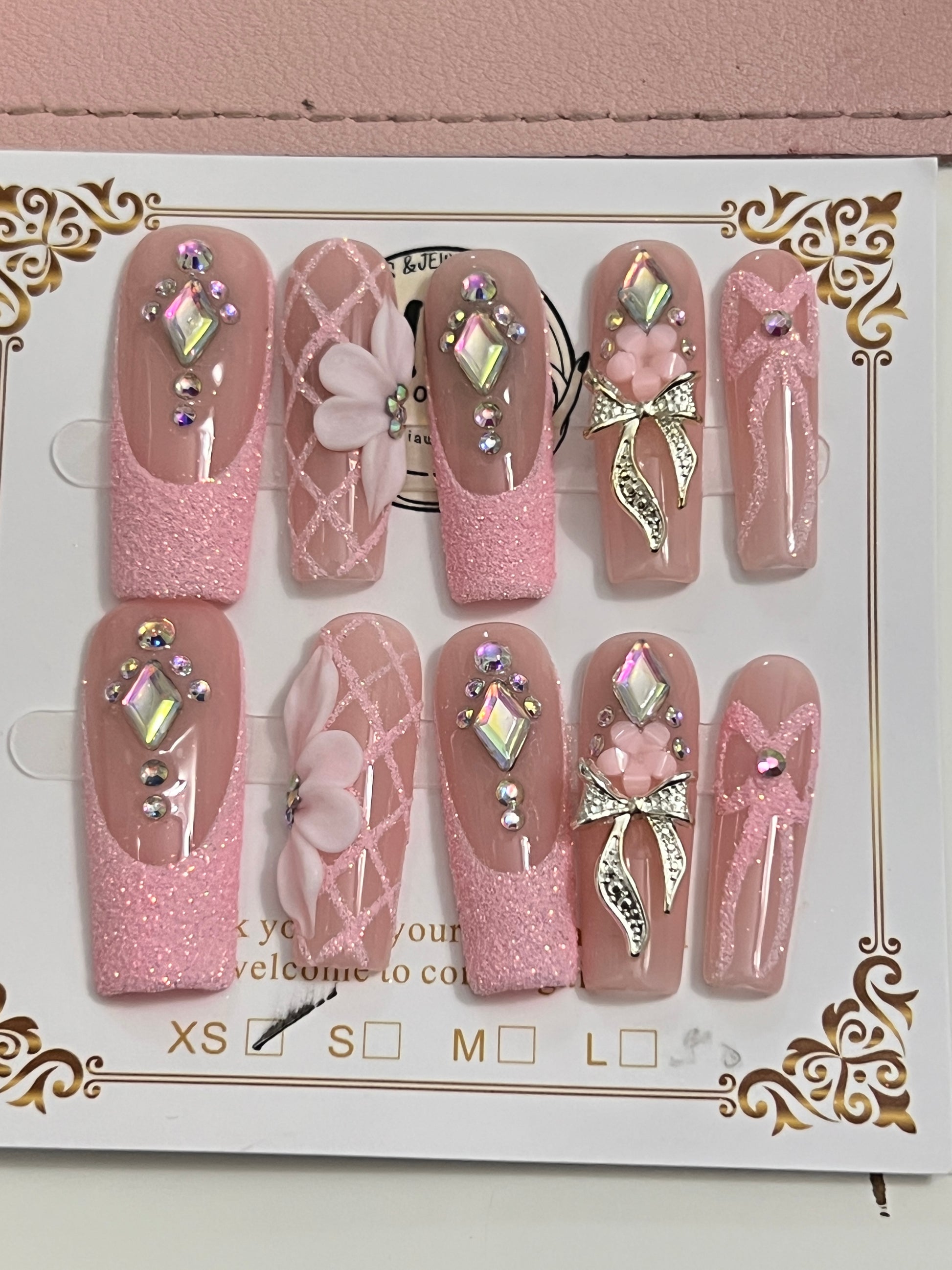 Ballet Princess is a set of handmade press-on nails inspired by the elegance of ballet and the sweetness of fairytale romance. The design combines soft nude-pink tones with glittery sugar pink tips, enhanced by 3D bows, floral accents, and sparkling rhinestones. Silver ribbon charms and netted patterns add a delicate, couture-like touch — perfect for birthdays, dates, or anyone who loves the graceful charm of a pink dream.