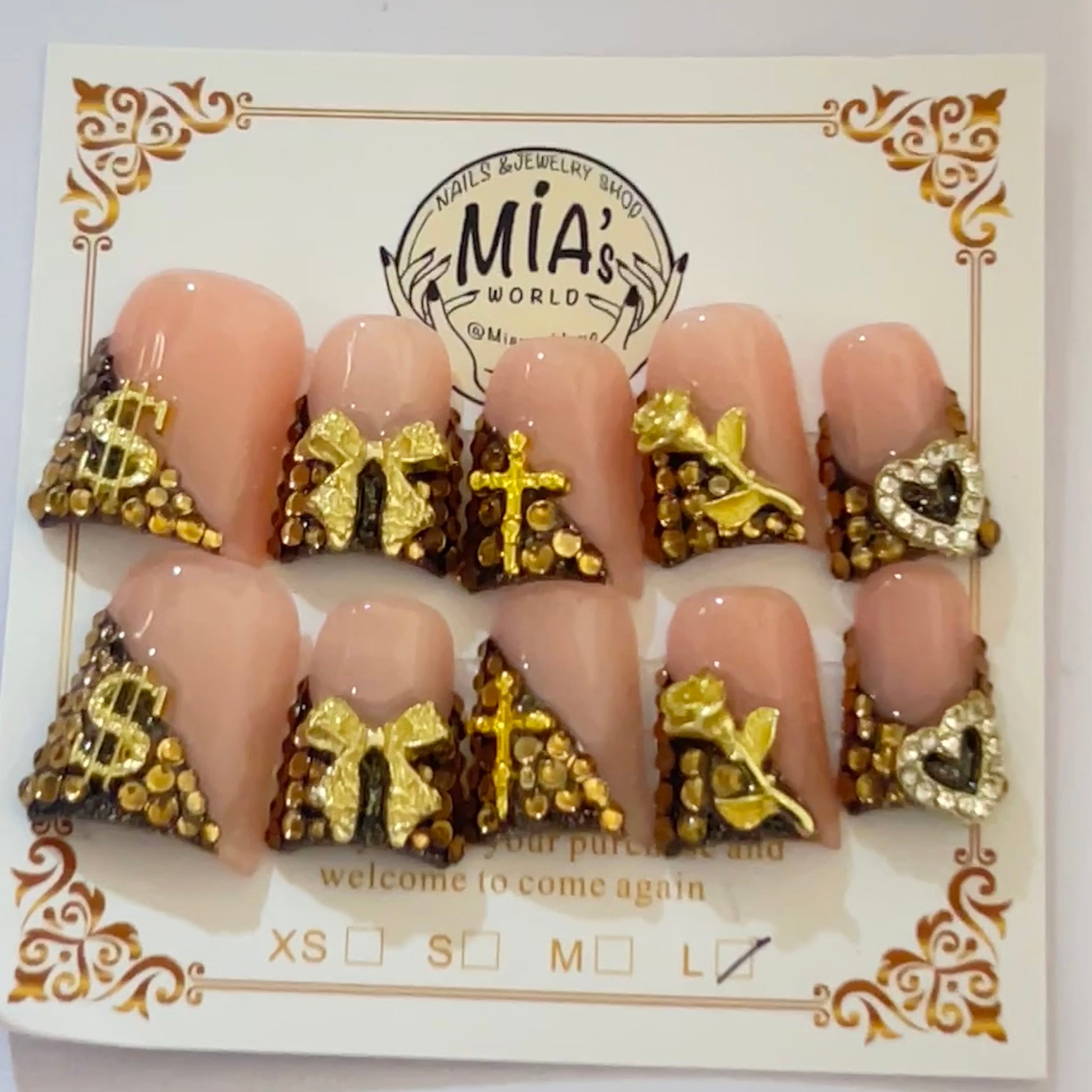 Each set is handcrafted with meticulous attention to detail. Lasts up to 2 weeks with simple application. Includes 10 press-on nails in assorted sizes, adhesive tabs, nail glue, cuticle stick, mini file, and alcohol pad.