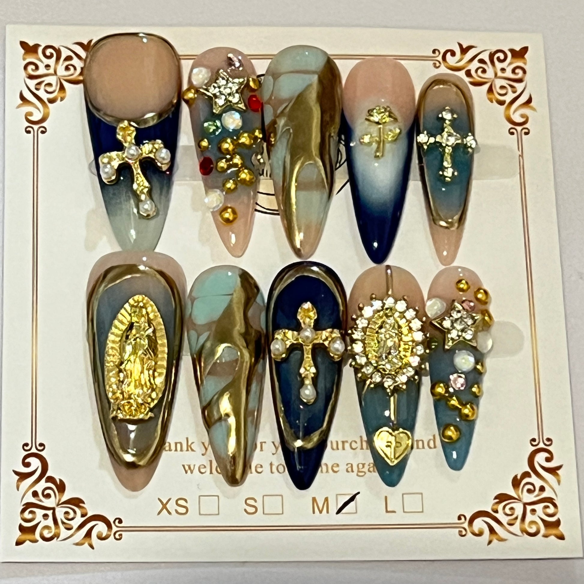 Each set is handcrafted with meticulous attention to detail. Lasts up to 2 weeks with simple application. Includes 10 press-on nails in assorted sizes, adhesive tabs, nail glue, cuticle stick, mini file, and alcohol pad.