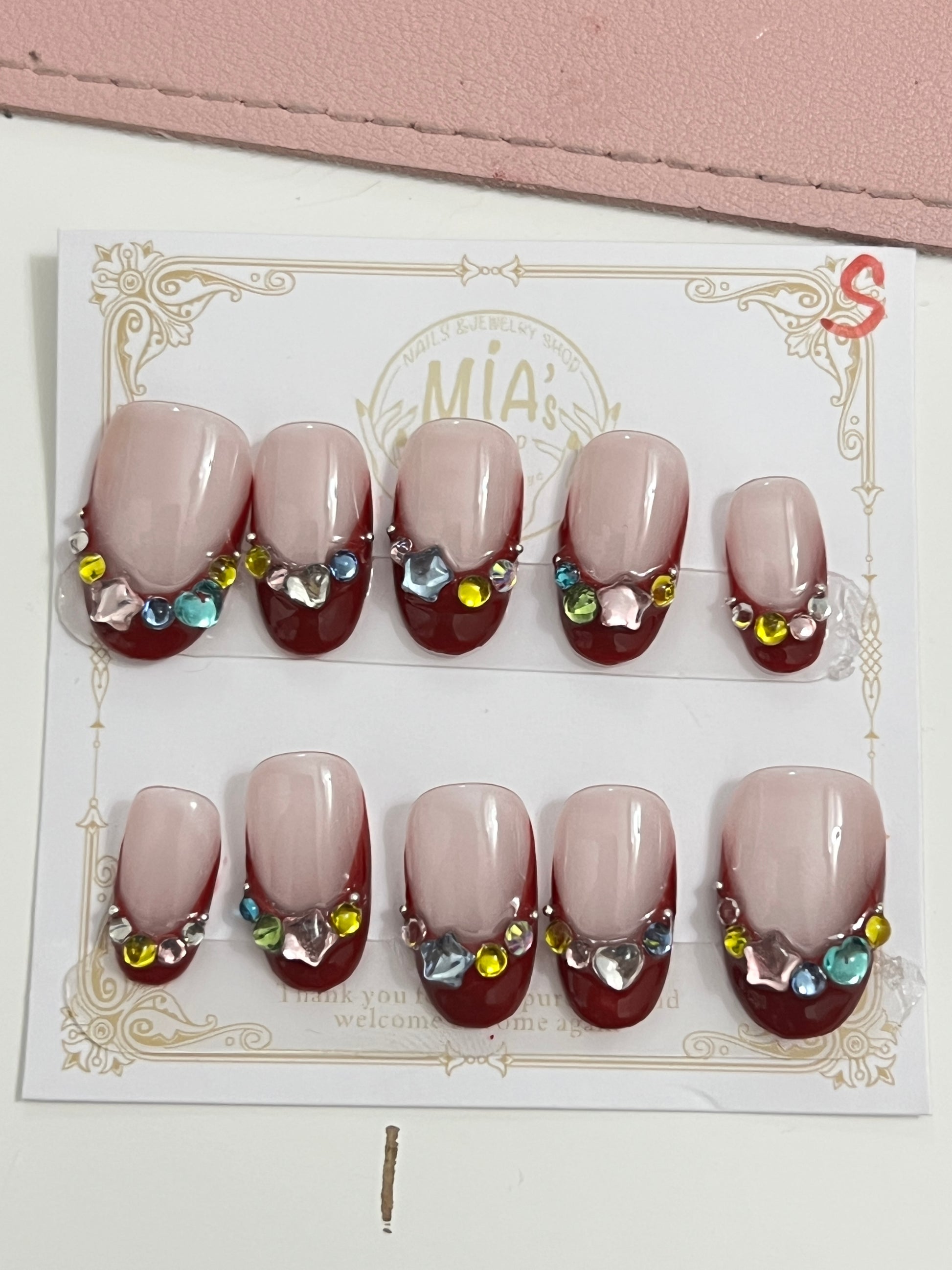 Ruby Radiance is a set of handmade press-on nails designed to capture the essence of festive glamour. Featuring a soft blush gradient base paired with deep ruby-red French tips, each nail is embellished with vibrant multicolor gemstones that sparkle from every angle. This dazzling combination of warm tones and crystal brilliance makes it perfect for holidays, parties, or anyone who loves a bold yet elegant look.