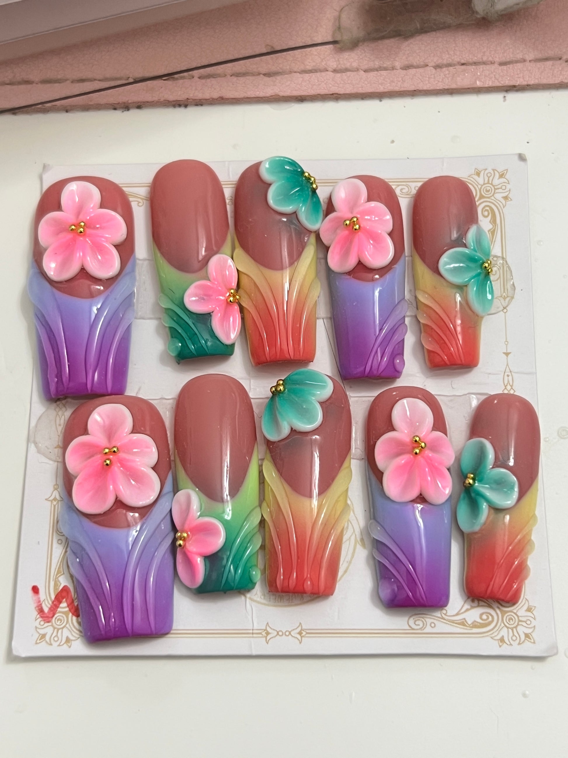 Tropical Mirage is a set of handmade press-on nails bursting with color and creativity. The design features a rich rose-brown upper base blending into a vivid rainbow gradient, adorned with oversized 3D flowers in pink and turquoise hues. Each petal shines with a golden bead center, giving the design a luxurious and artistic finish. Perfect for summer vacations, beach parties, or anyone who loves bold, statement-making nail art that feels like wearable art.