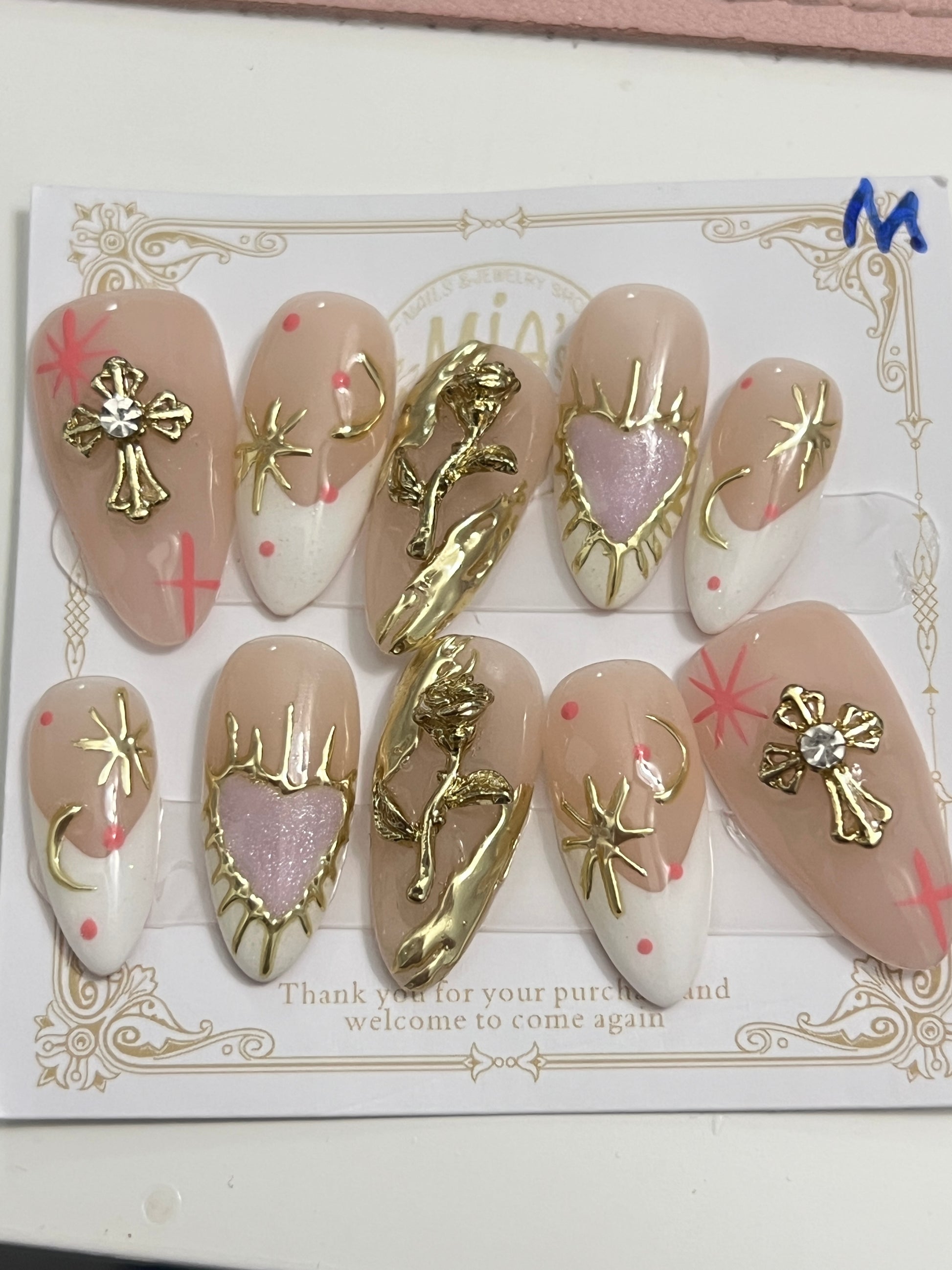 Twilight is a handmade press-on nail set featuring soft nude tones with shimmering lavender hearts, gold celestial motifs including crosses, moons, and stars, and sculpted roses. The design blends romantic elements with gothic undertones, suitable for night-out looks, creative expression, or those drawn to intricate, darkly elegant aesthetics.