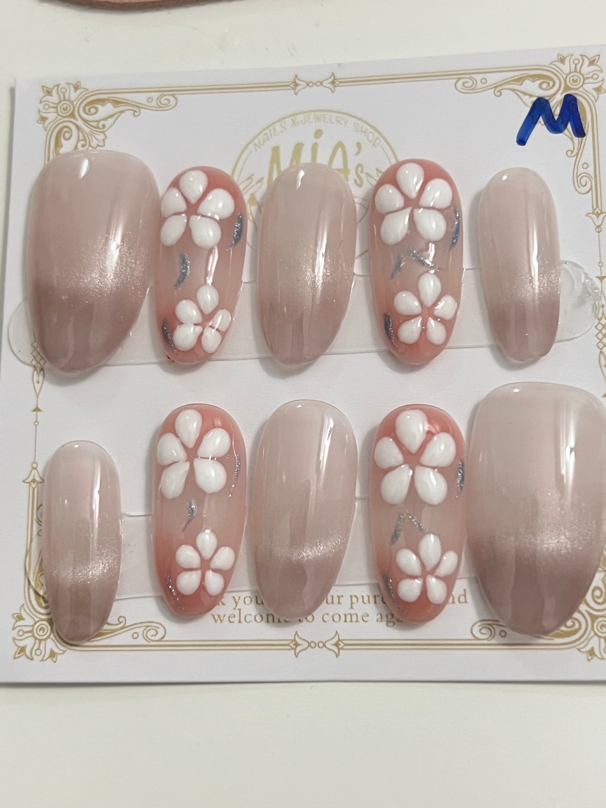 Whisper Daisy is a handmade press-on nail set featuring a soft nude-to-rose gradient base with hand-sculpted white five-petal flowers and silver leaf accents. The subtle pearlescent finish adds a gentle glow, creating a look that works beautifully for daily wear, weddings, or anyone who appreciates natural, understated elegance.