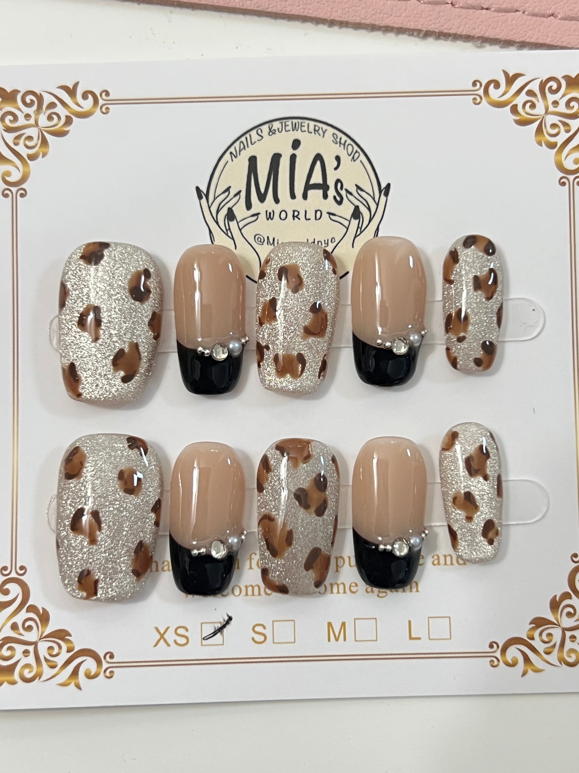 Wild Leopard is a set of nails designed for the bold and fashionable. This unique set alternates between shimmering silver leopard print nails and elegant nude-black French tips, adorned with petite pearl accents. The mix of metallic shine and animal-inspired patterns creates a luxurious yet edgy contrast — perfect for those who love to blend wild energy with refined style.